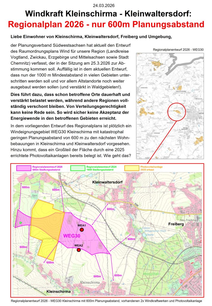 Der Windkraftstammtisch hat sich am 26.09.2025 wegen der massiven Geräuschbelastung in einem offenen Brief sowohl an die Leipziger Stadtwerke (Investor) als auch an eab New Energy Großschirma (Planung/Ausführung) gewandt. Von beiden Seiten liegt bisher keine Stellungnahme vor. Das Landratsamt Mittelsachsen als Genehmigungsbehörde beteuert bis jetzt die Korrektheit des Genehmigungsprozesses, obwohl sich deutliche Diskrepanzen zwischen den in der Immissionsschutzrechtlichen Genehmigung prognostizierten dBA Beurteilungspegeln und den jetzt tatsächlich bei ersten orientierenden Messungen festgestellten dBA Pegeln zeigen, abgesehen davon, dass die besonders belastend wirkenden niederfrequenten Schallanteile beim dBA Beurteilspegel von vornherein nahezu vollständig ausgefiltert werden, also kaum in den dBA Beurteilungspegel einfließen.